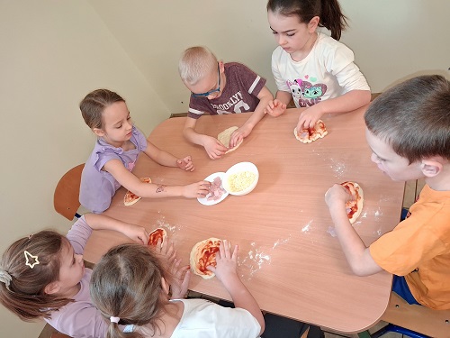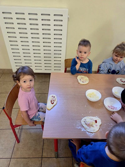 Dzieci miały okazję stać się małymi kucharzami i przygotować własną pizzę. Najpierw formowały placki, a następnie dodawały ulubione składniki. Po pierwszym etapie, czyli samodzielnym wykonaniu, przyszedł czas na oczekiwanie, które umilały nam wesołe piosenki związane z Dniem Pizzy.