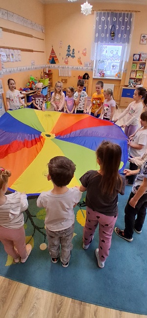 Podczas zajęć dzieci dowiedziały się, skąd pochodzi pizza oraz jakie składniki są potrzebne do jej przygotowania. Przedszkolaki wykonywały kolorowe pizze z papieru, wykorzystując różnorodne techniki plastyczne. Brały również udział w zabawach ruchowych z chustą animacyjną, która swoim kształtem przypominała pizzę.