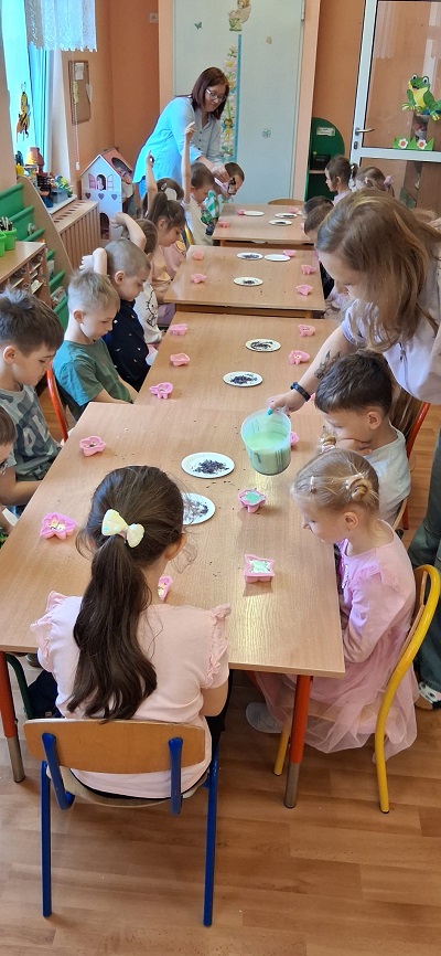 W dniach 14, 15 kwietnia 2026r odbyły się w naszym przedszkolu warsztaty mydlarskie, prowadzone przez Panie z Domu Przyrodnika w Hażlachu. To niecodzienna okazja, aby uczestnicy własnoręcznie mogli wykonać pachnące i idealne do kąpieli mydło.