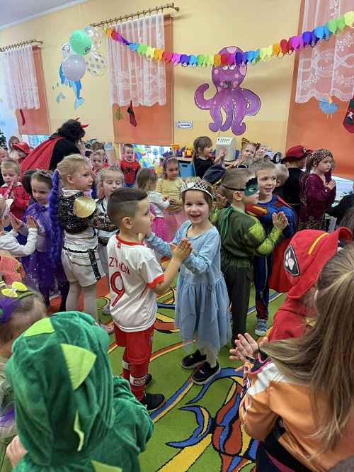 Bal dostarczył dzieciom mnóstwo radości i uśmiechu, sprzyjając integracji grup oraz rozwijaniu ekspresji ruchowej.