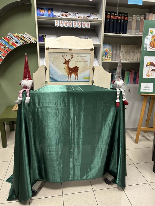 Następnie, wprowadzając w świąteczny klimat, dzieci odwiedziły bibliotekę szkolną, gdzie wysłuchały bajki „Jelonek Lucek i sanie Świętego Mikołaja”, przedstawionej w formie japońskiego teatrzyku Kamishibai. Ta niezwykła forma opowieści całkowicie pochłonęła uwagę małych słuchaczy, przenosząc ich do świata pełnego reniferów, śniegu i mikołajkowych przygód.