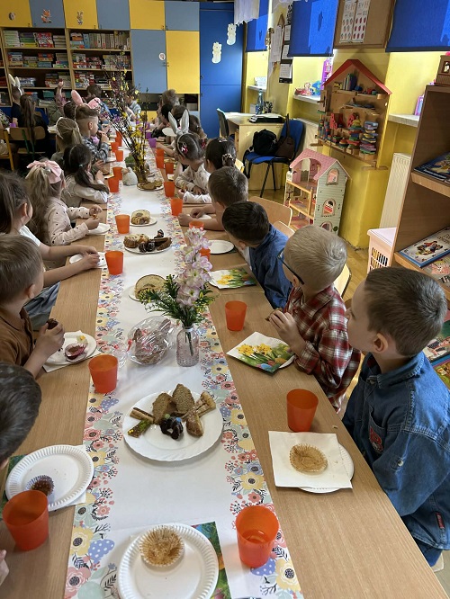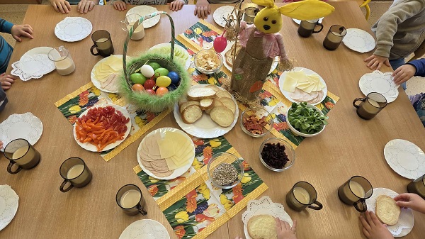 W dniu dzisiejszym, tj. 1 kwietnia w kilku grupach, odbyło się uroczyste Śniadanie Wielkanocne, podczas którego dzieci dzieliły się jajkiem i składały życzenia. Na pięknie udekorowanych stołach nie zabrakło tradycyjnych wielkanocnych przysmaków. Były baby, babeczki , mazurki, czekoladowe zajączki i pisanki, jak również „murzyny”. Podczas śniadania dzieci miały okazję wspólnie spędzić czas i porozmawiać o tradycjach wielkanocnych. Nie zabrakło również drobnych prezentów od zajączka.