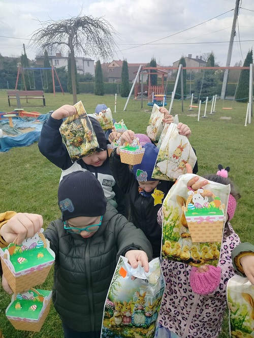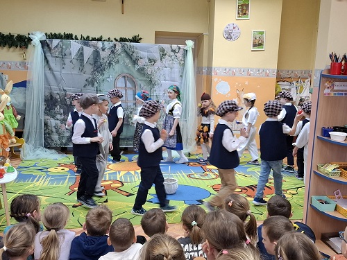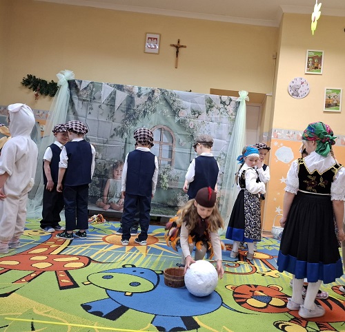 Dzieci z grupy „Trefliki” przygotowały wspaniałe przedstawienie pt. „Chodzimy z kogucikiem”, na które zastali zaproszeni wszystkie przedszkolaki, personel i rodzice. Mali aktorzy ubrani odświętnie, a niektórzy w stroje ludowe, zaprezentowali przygotowane i wyćwiczone dużo wcześniej wiersze i piosenki związane ze Świętami Wielkiejnocy. Przybliżyli również publiczności tradycje i zwyczaje związane z tymi świętami.