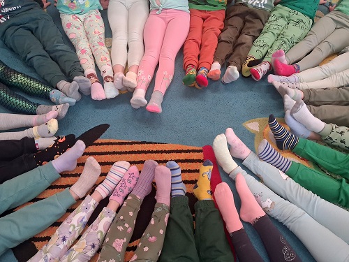 Wszyscy założyli kolorowe, nie do pary skarpetki jako symbol akceptacji i różnorodności.