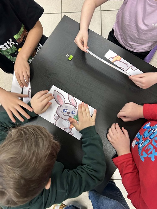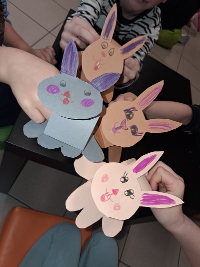 Najstarsze dzieci z naszego przedszkola, czyli grupy „Misie” i „Sówki” brały udział w kreatywnych warsztatach łączące czytanie opowiadania z tworzeniem pracy plastycznej z kolorowego papieru – „Wielkanocny zajączek”.